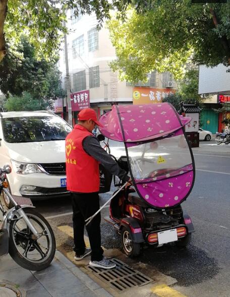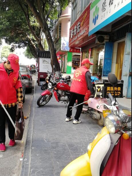 图为志愿者在街边清理垃圾、将摩托车按规定摆放好