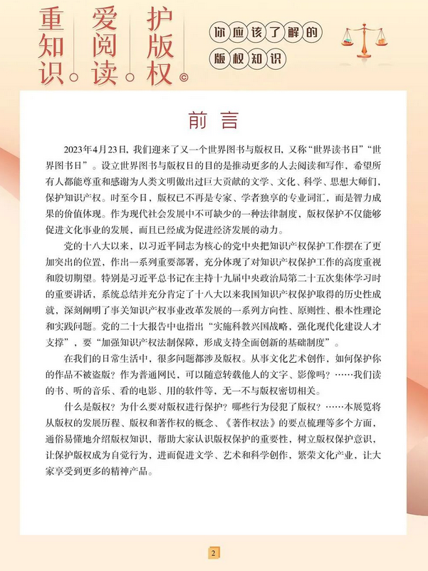 1 党的十八大以来,以习近平同志为核心的党中央把知识产权保护工作摆在了更加突出的位置,作出一系列重要部署,充分体现了对知识产权保护工作的高度重视和殷切期望。2021年,中共中央、国务院印发的《知识产权强国建设纲要(2021—2035年)》绘就了新时代知识产权强国的宏伟蓝图。国家版权局印发的《版权工作“十四五”规划》对“十四五”时期版权工作的指导思想、基本原则、发展目标、重点任务等进行了安排谋划。一系列关系版权工作的重要政策和国家重点专项规划,使版权工作的顶层设计得到根本性加强,中国版权事业正朝气蓬勃地迈向新征程。 什么是版权?为什么要对版权进行保护?哪些行为侵犯了版权?……本展览将从版权的发展历程、版权和著作权的概念、《著作权法》的要点梳理等多个方面,通俗易懂地介绍版权知识,帮助大家认识版权保护的重要性,树立版权保护意识,让保护版权成为自觉行为,进而促进文学、艺术和科学创作,繁荣文化产业,让大家享受到更多的精神产品。 2 主办单位:江华瑶族自治县图书馆 协办单位:神州共享(北京)文化传媒有限公司 展览内容