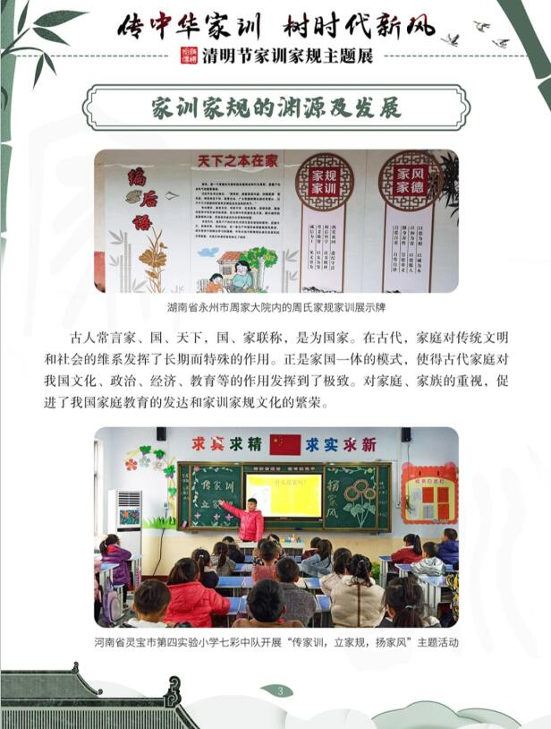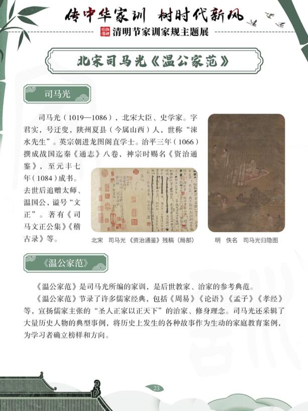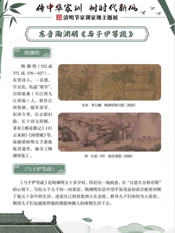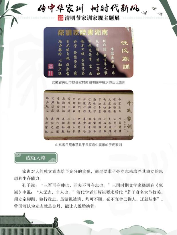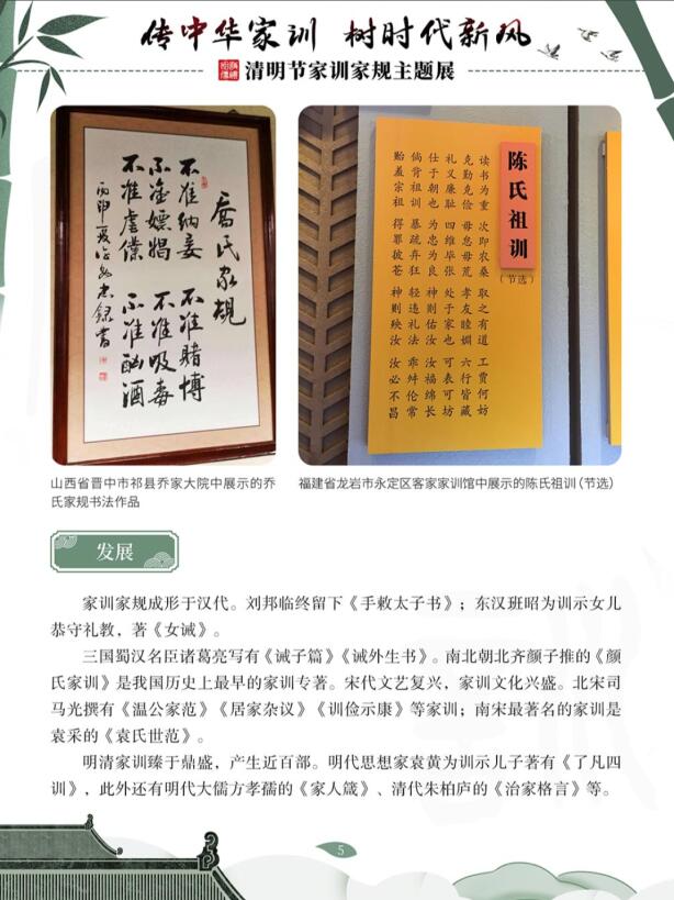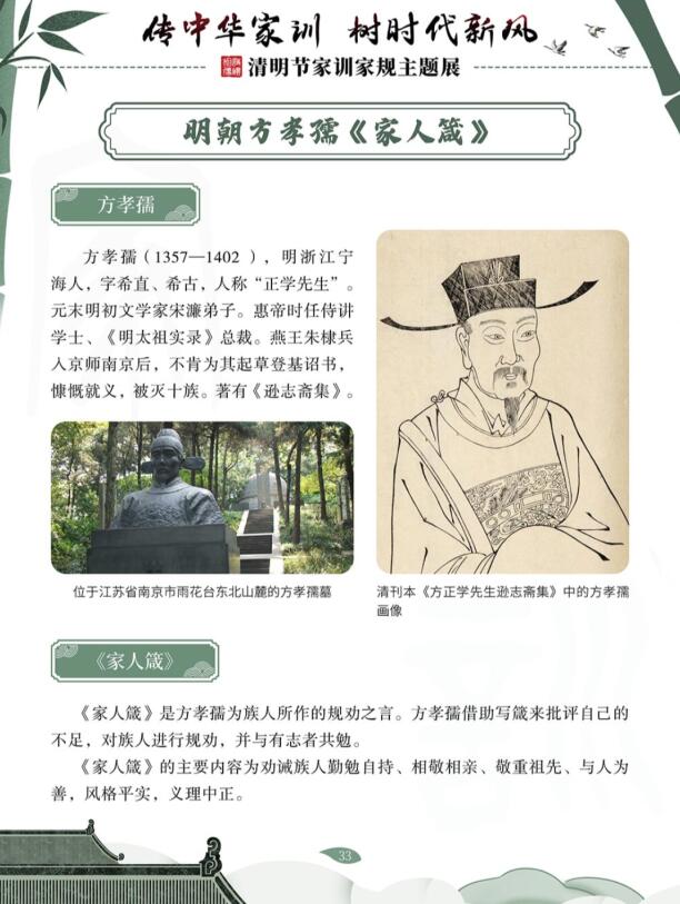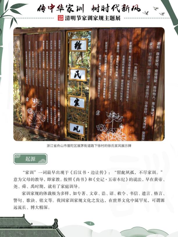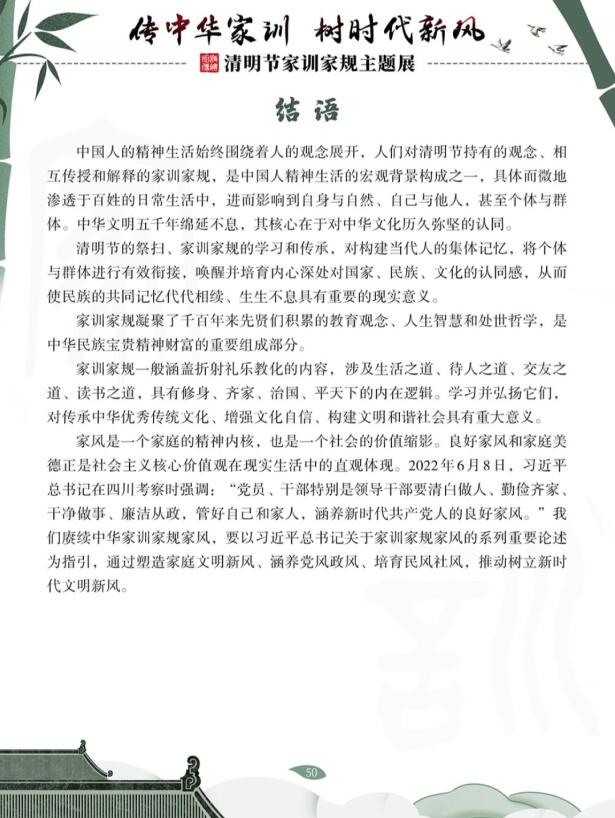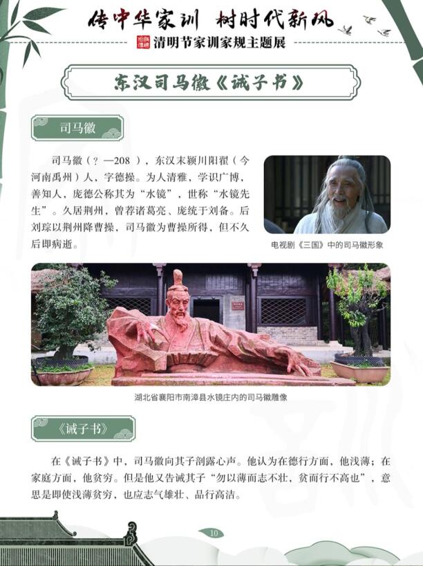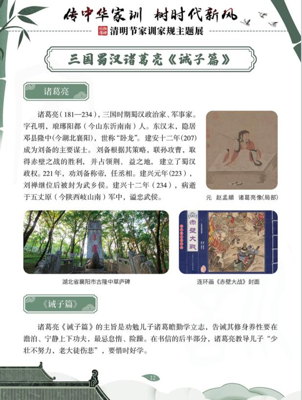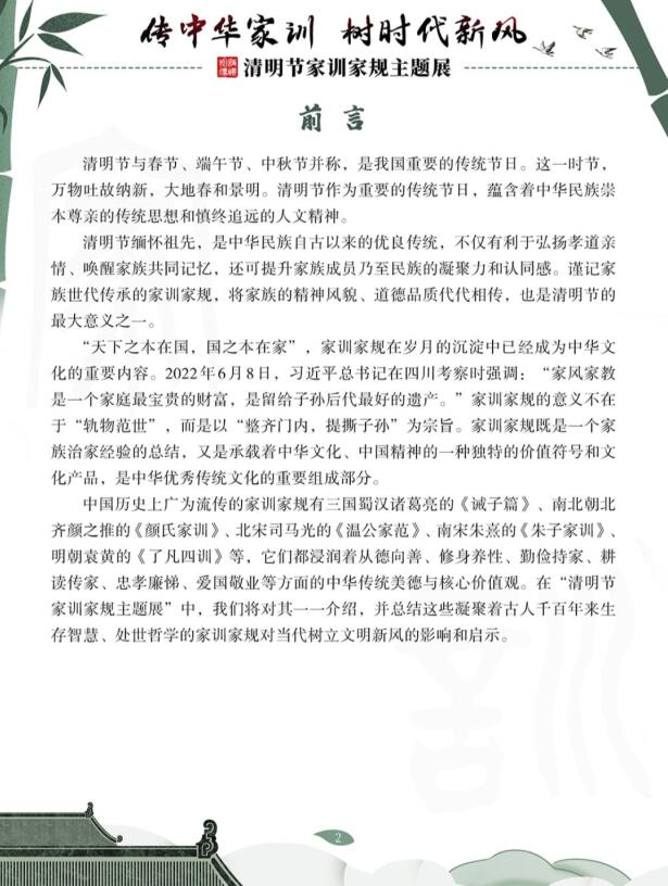 1 清明节与春节、端午节、中秋节并称,是我国重要的传统节日。这一时节,万伍吐故纳新,大地春和景明。清明节作为重要的传统节日,蕴含着中华民族崇本尊亲的传统思想和慎终追远的人文精神。 清明节缅怀祖先,是中华民族自古以来的优良传统,不仅有利于弘扬孝道亲情、唤醒家族共同记忆,还可提升家族成员乃至民族的凝聚力和认同感。谨记家族世代传承的家训家规,将家族的精神风貌、道德品质代代相传,也是清明节的最大意义之一。 家训家规既是一个家族治家经验的总结,又是承载着中华文化、中国精神的一种独特的价值符号和文化产品,是中华优秀传统文化的重要组成部分。 中国历史上广为流传的家训家规有三国蜀汉诸葛亮的《诫子篇》、南朝北朝齐颜之推的《颜氏家训》、北宋司马光的《温公家范》、南宋朱熹的《朱子家训》、明朝袁黄的《了凡四训等,它们都浸润着从德向善、修身养性、勤俭持家、耕读传家、忠孝廉悌、爱国敬业等方面的中华传统美德与核心价值观。在“清明节家训家规主题展”中,我们将对其一一介绍,并总结这些凝聚着古人千百年来生存智慧、处世哲学的家训家规对当代树立文明新风的影响和启示。 2 主办单位:江华瑶族自治县图书馆 协办单位:神州共享(北京)文化传媒有限公司 展览内容