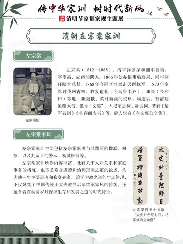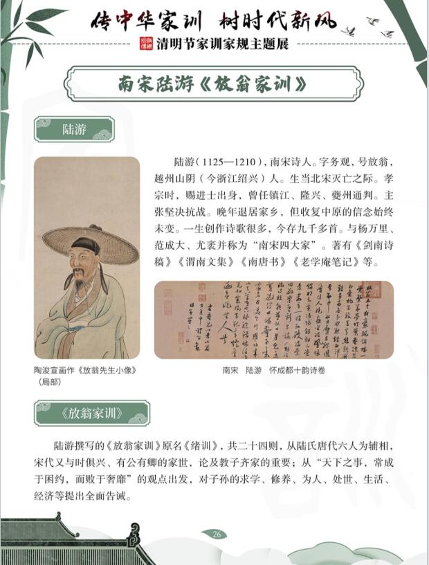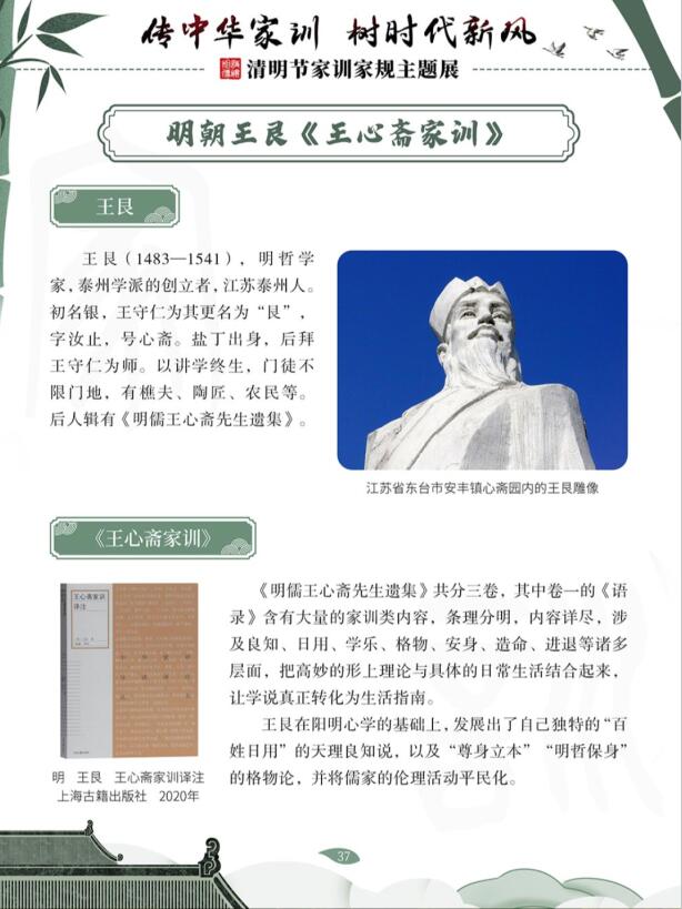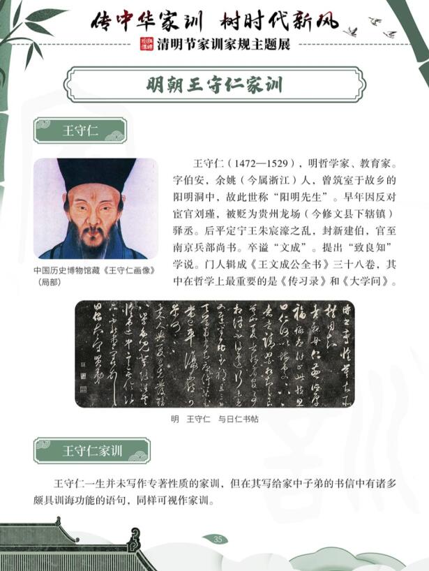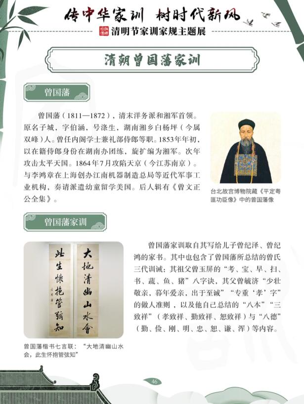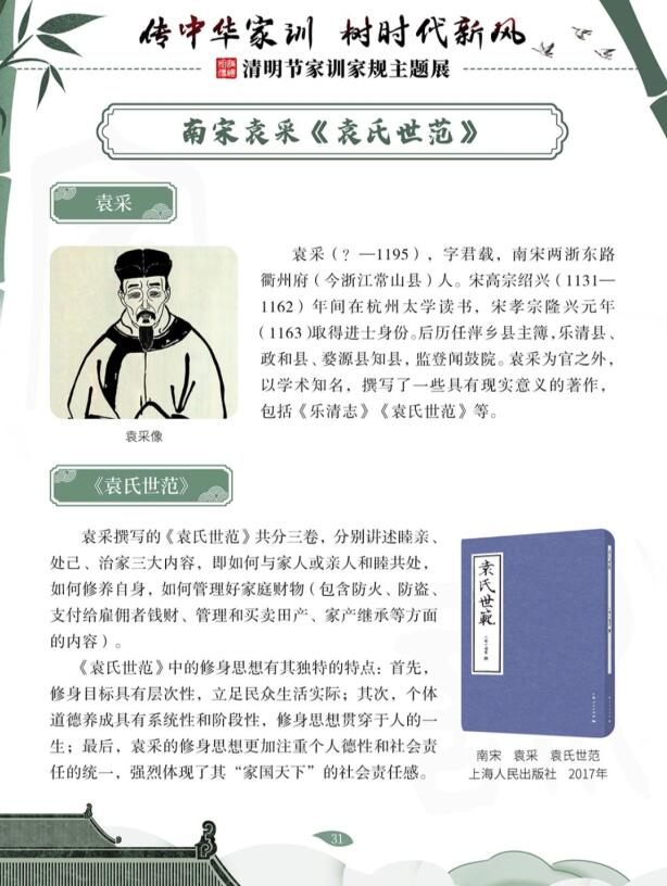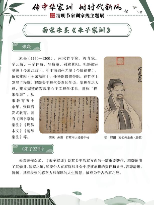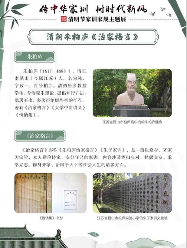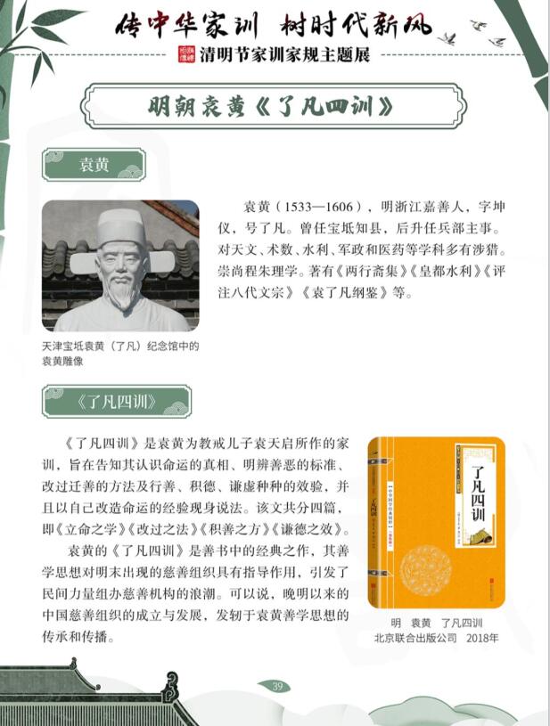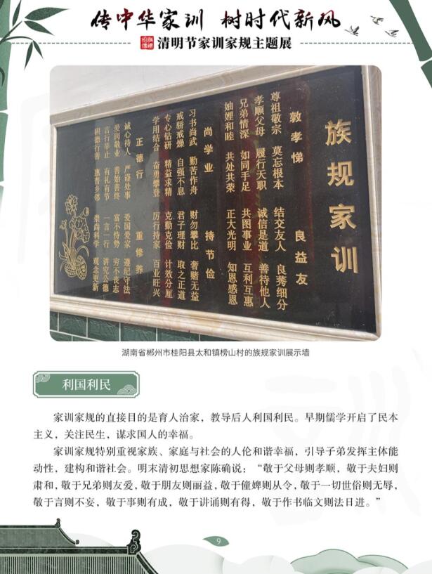 1 清明节与春节、端午节、中秋节并称,是我国重要的传统节日。这一时节,万伍吐故纳新,大地春和景明。清明节作为重要的传统节日,蕴含着中华民族崇本尊亲的传统思想和慎终追远的人文精神。 清明节缅怀祖先,是中华民族自古以来的优良传统,不仅有利于弘扬孝道亲情、唤醒家族共同记忆,还可提升家族成员乃至民族的凝聚力和认同感。谨记家族世代传承的家训家规,将家族的精神风貌、道德品质代代相传,也是清明节的最大意义之一。 家训家规既是一个家族治家经验的总结,又是承载着中华文化、中国精神的一种独特的价值符号和文化产品,是中华优秀传统文化的重要组成部分。 中国历史上广为流传的家训家规有三国蜀汉诸葛亮的《诫子篇》、南朝北朝齐颜之推的《颜氏家训》、北宋司马光的《温公家范》、南宋朱熹的《朱子家训》、明朝袁黄的《了凡四训等,它们都浸润着从德向善、修身养性、勤俭持家、耕读传家、忠孝廉悌、爱国敬业等方面的中华传统美德与核心价值观。在“清明节家训家规主题展”中,我们将对其一一介绍,并总结这些凝聚着古人千百年来生存智慧、处世哲学的家训家规对当代树立文明新风的影响和启示。 2 主办单位:江华瑶族自治县图书馆 协办单位:神州共享(北京)文化传媒有限公司 展览内容