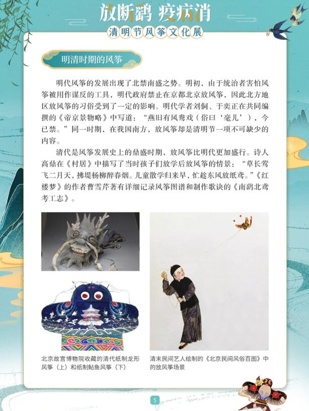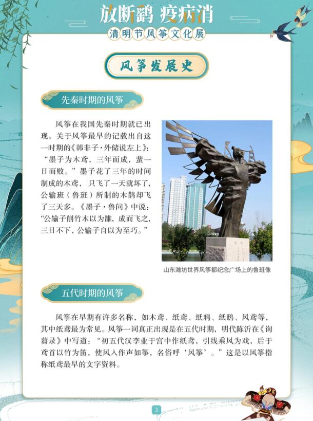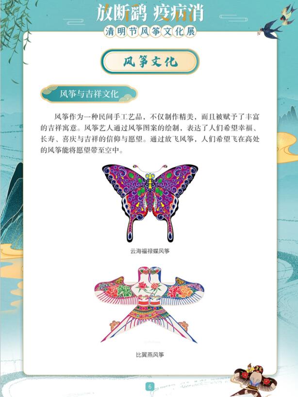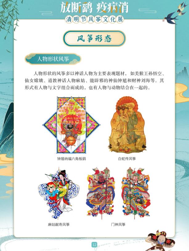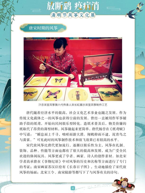 1 风筝作为一项古老的民间体育活动,有着两千多年的历史,逐步成为我国民俗文化的重要内容,是中华民族对现代文明的杰出贡献之一。 风筝象征着吉祥、福气。放风筝就是“放吉祥”“放福气”,风筝飞得越高,福气越多。在风筝上到处可以看到吉祥寓意和吉祥图案的影子,着充分表明了人们对美好生活的向往和期待。 值此清明节到来之际,我们特别策划了“放断鹞 疫病消---清明节风筝文化展”,通过风筝发展史、风筝文化、风筝形态、风筝结构、风筝功能、风筝流派六个部分展览展示,带领大家了解风筝知识,品鉴风筝艺术的绚烂多姿,从而更好地感受中华优秀传统文化的独特魅力。 2 主办单位:江华瑶族自治县图书馆 协办单位:神州共享(北京)文化传媒有限公司 展览内容