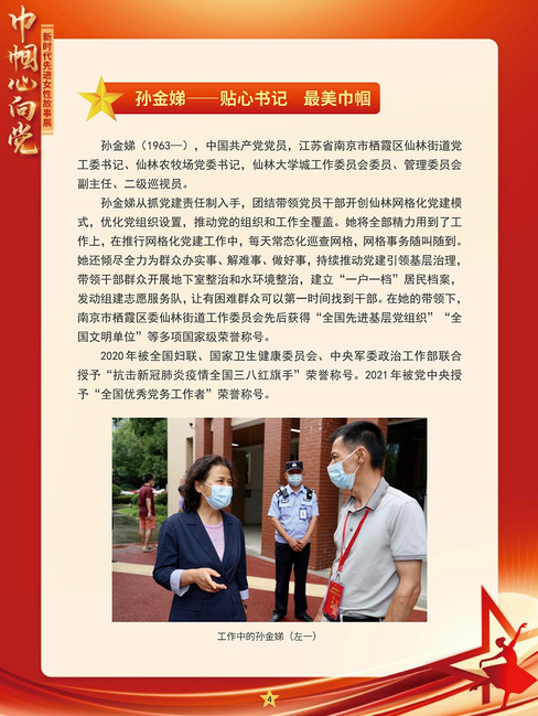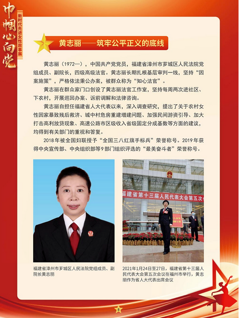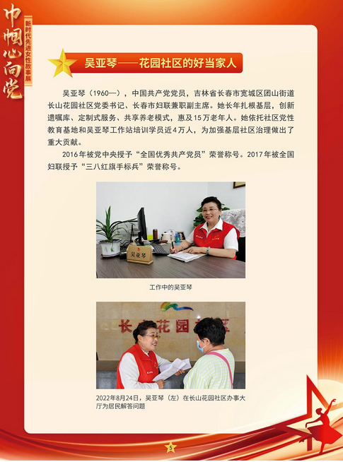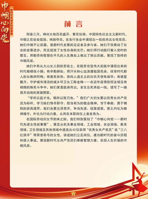 1 阳春三月,神州大地百花盛开、繁花似锦。中国特色社会主义新时代,巾帼之花处处绽放、绚丽夺目,在各行各业中涌现出一批批杰出女性党员。她们巾帼不让须眉,是新时代发展的见证者及参与者。她们不仅推动了社会的发展进步,而且绽放了女性自身的光芒;她们用行动践行着入党时的誓言,用勤劳和智慧在平凡的人生舞台上做出了突出贡献,展现了别样的巾帼风采。 她们中有从大山女儿到扶贫战士,在脱贫攻坚伟大实践中涌现出来的时代楷模张小娟;有辛勤耕耘、用汗水和心血浇灌祖国花朵、培育时代新人的女教师何梅;有救死扶伤、崇尚人道主义的白衣天使朱丽华;有披星戴月、守护城市清洁的城乡环卫女工陈金梅……在近年疫情防控这场没有硝烟的殊死斗争中,她们更是挺身而出,舍生忘死奔赴一线,谱写了一曲感天动地的英雄赞歌。 “学所以益才也,砺所以致刃也。”我们广大妇女要以优秀女共产党员为标杆,学习她们恪尽职守、担当有为的敬业精神,甘于奉献、勇于牺牲的崇高境界。我们也要见贤思齐,争当先进、锐意进取,使之内化为精神操守,外化为行动力量,从而在本职岗位上奋发有为。 在国际劳动妇女节到来之际,我们特别策划了“巾帼心向党——新时代先进女性故事展”。展览从机关事业领域、工业领域、农业领域、教育领域、卫生领域及其他领域中遴选出42位获得“优秀女共产党员”或“三八红旗手"等荣誉称号的女性,讲述她们的奋斗历程和感人事迹,展现新时代女共产党员们奉献智慧力量、实现人生价值的巾帼风采。 2 主办单位:江华瑶族自治县图书馆 协办单位:神州共享(北京)文化传媒有限公司 展览内容