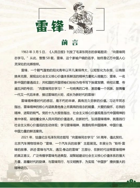 1 雷锋,是一个时代的符号,本身代表了那个年代的纯与真,代表了奋斗与奉献;雷锋,又绝非仅仅是一个时代的符号,雷锋精神本质上是中华民族文化的延续与传承,具有历史弥新的价值。 通过展览,相信您一定会了解一个更加真实的雷锋,并体会道“身边的雷锋”给我们带来的感动和温暖。在今天,雷锋精神是忙忙碌碌间坚持不懈的信心,平平凡凡中向他人伸出的一双手,分分秒秒里给大家露出的微笑,当“雷锋”成为一种力量,无时无刻不在我们的生活工作中体现,温暖着你我他。学雷锋人人可为、处处可为、时时可为! 亲爱的朋友们,让我们携起手来,从自己做起、从现在做起、从点滴做起,学习雷锋,争当雷锋,将雷锋精神广播在祖国大地上,为实现中华民族伟大复兴的“中国梦”而奋斗! 2 主办单位:江华瑶族自治县图书馆 协办单位:神州共享(北京)文化传媒有限公司 展览内容