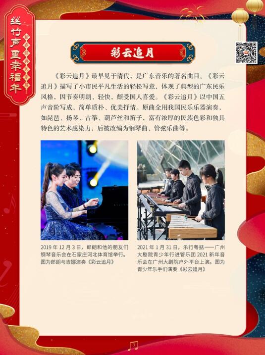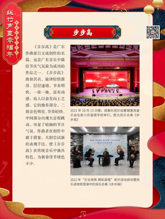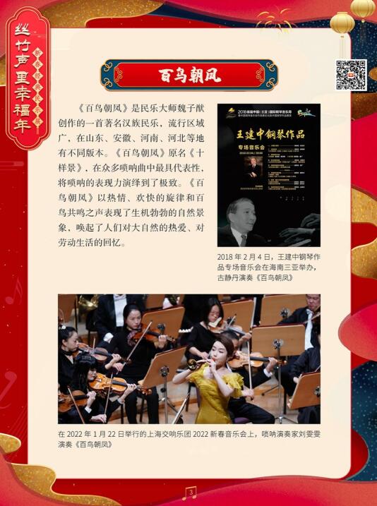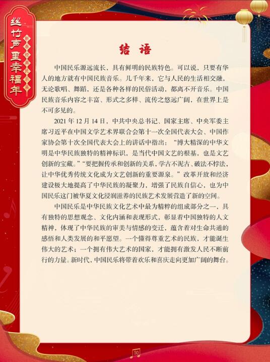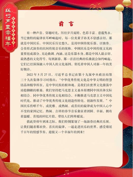 1 有一种声音,穿越时光,历经岁月流转,色彩丰富、意蕴隽永。当它独特的旋律在耳畔响起时,每一位炎黄子孙无不倍感亲切,那就是中国民乐。中国民乐历史悠久,是用中国传统乐器,以独奏、合奏形式演奏的民间传统音乐的统称。中国民乐是中国传统文化的重要组成部分,无论曲调、内涵,还是乐器本身,都是中国人最亲切、最熟悉的文化符号。每到新春,那一首首经典的乐曲就会如约响起,它们已经深深融入中国人的文化基因,寄托着中国人对新一年的美好期许。 2022年5月27日,习近平总书记在第十九届中央政治局第三十九次集体学习时指出:“中华优秀传统文化是中华文明的智慧结晶和精华所在,是中华民族的根和魂,是我们在世界文化激荡中站稳脚跟的根基。我们坚持把马克思主义基本原理同中国具体实际相结合、同中华优秀传统文化相结合,不断推进马克思主义中国化时代化,推动了中华优秀传统文化创造性转化、创新性发展。”中国民乐传唱千年,或优雅、或热闹、或喜庆的旋律成为中国人心中不变的家国记忆。热闹、吉祥的春节音乐象征着团圆、幸福,拥有着温暖、喜悦的回忆片段,带给人们阵阵暖流。 值此癸卯年,我们特别策划了一场新春经典民乐展。让我们随着那欢快、喜庆的旋律,一起走进民乐的世界,感受绵延千百年的情感节奏,迎接又一个幸福年的到来! 2 主办单位:江华瑶族自治县图书馆 协办单位:神州共享(北京)文化传媒有限公司 展览内容
