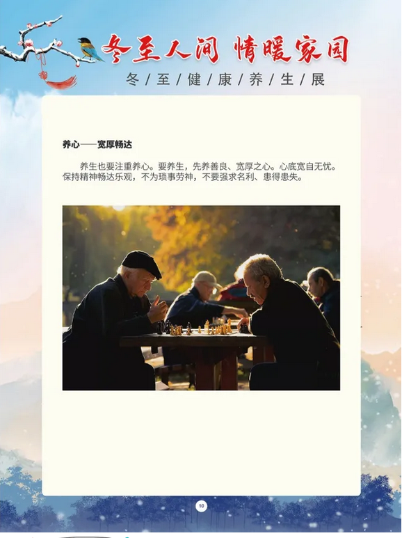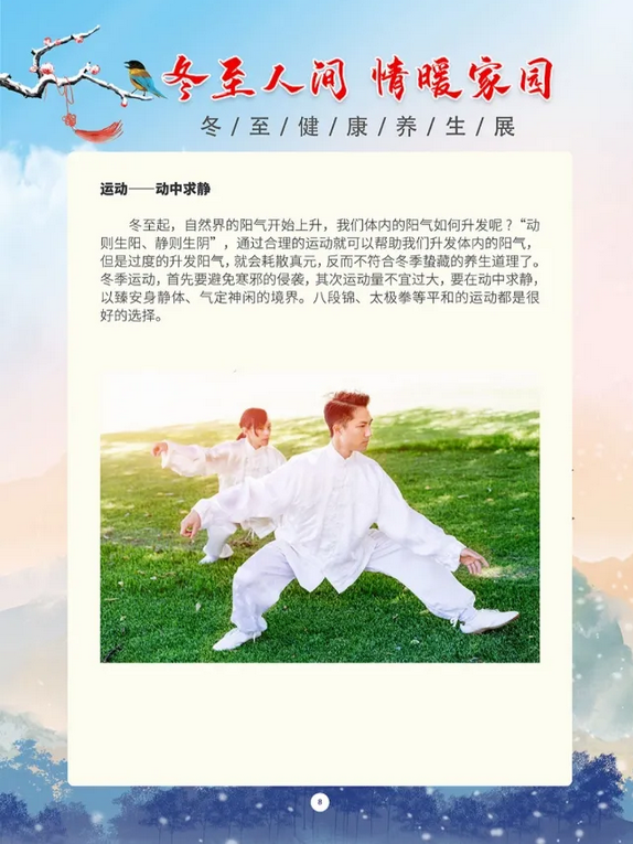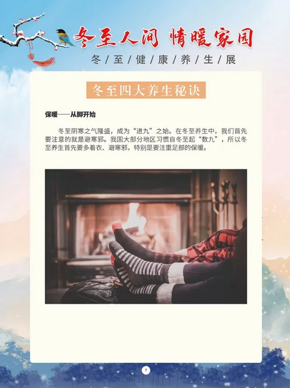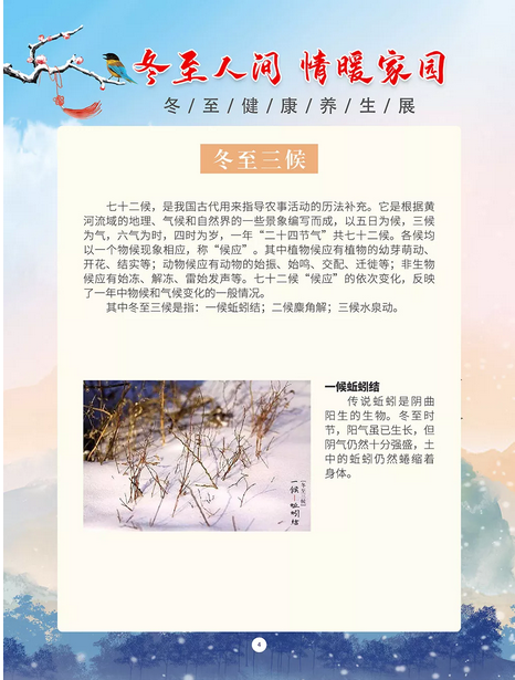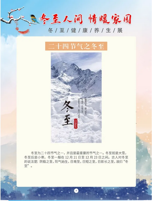 冬至,俗称“冬节”“长至节”“亚岁”等,早在2500多年前的春秋时代,我国已经用土圭观测太阳测定出冬至来了,它是二十四节气中最早制订出的一个。冬至一般在每年的12月21日至23日之间,而且冬至这天一定是北半球夜晚最长、白昼最短的一天。古人认为,冬至是阴阳转枢的日子,这一天之后,阴气渐消,阳气渐长,所以是很关键的养生时刻。人在这时只要顺应这一时令,遵循“冬藏”养生之道,做到多“储蓄”、少“透支”,就能健康长寿。值此冬至来临之际,我们特策划了“冬至人间,情暖家园——冬至健康养生展”,告诫人们越是在寒冷的季节,越要注重饮食起居,调理身心,加强锻炼,确保身体健康。