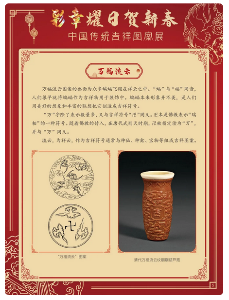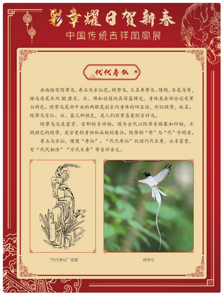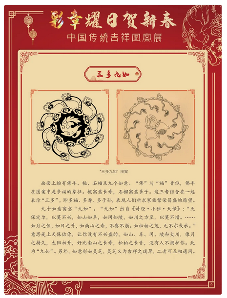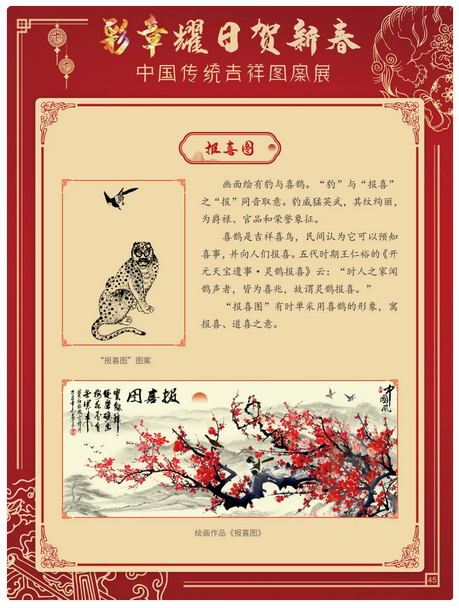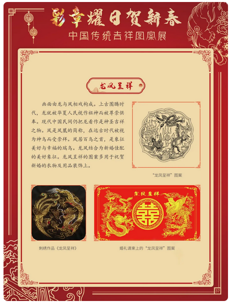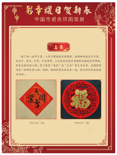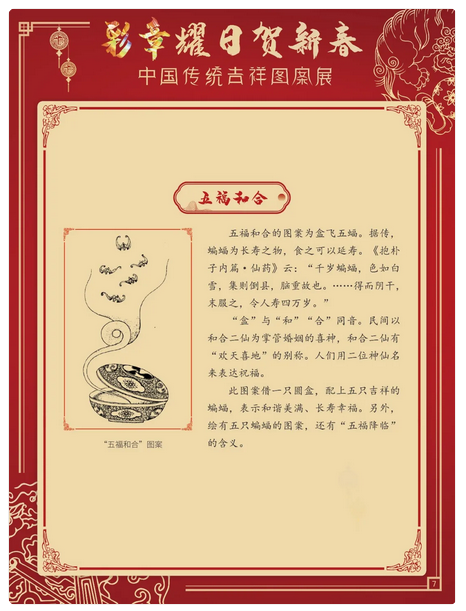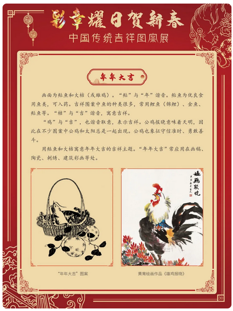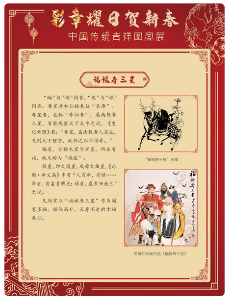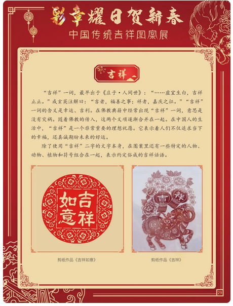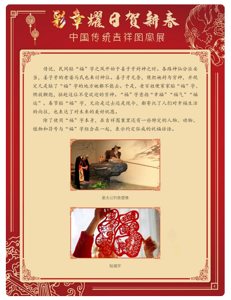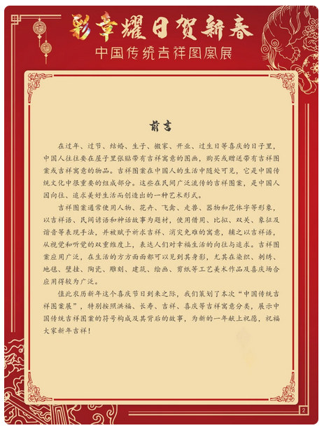 吉祥图案通常用人物、花卉、飞禽、走兽、器物和花体字等形象,以吉祥语、民间谚语和神话故事为题材,用借用、比拟、双关、象征以及谐音等表现手法,创造出图案与吉祥语的完美结合,被赋予祈求吉祥、消灾免难的寓意,从视觉和听觉的双重维度上,表达了人们对幸福生活的向往与追求。吉祥图案应用广泛,在生活的方方面面都可以见到其身影,尤其在染织、刺绣、地毯、壁挂、陶瓷、雕刻、建筑、绘画、剪纸等工艺美术用品以及喜庆场合应用的较为广泛。 值此农历新年的喜庆节日到来之际,我们策划了本次中国传统吉祥图案展,特别按照鸿福、长寿、吉祥、喜庆等吉祥寓意分类,展示中国传统吉祥图案的符号构成及其背后的故事,为新的一年献上祝愿,祝福大家新年吉祥! 江华瑶族自治县图书馆