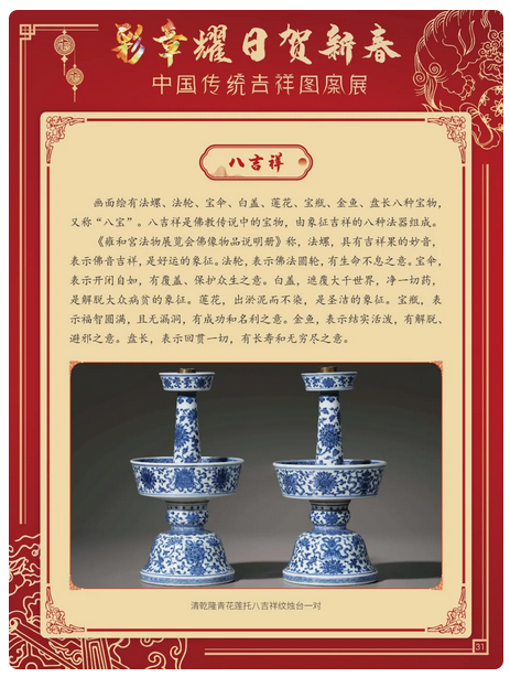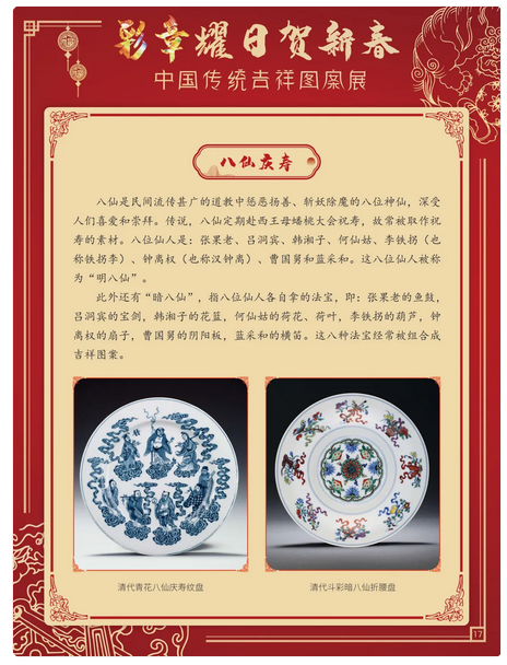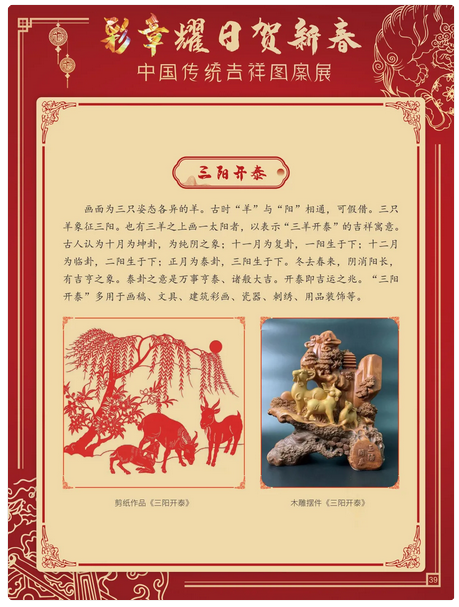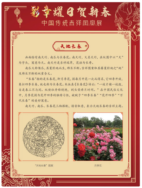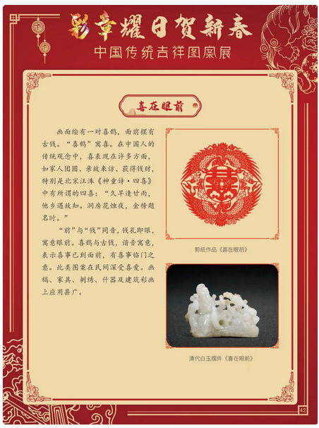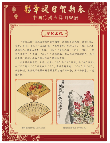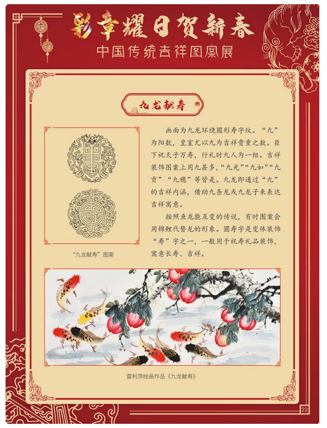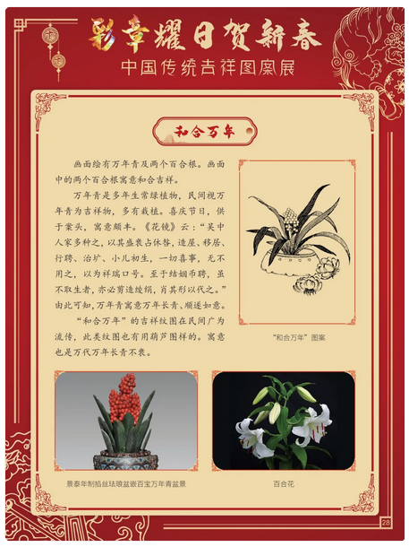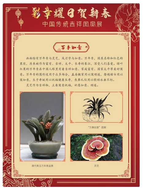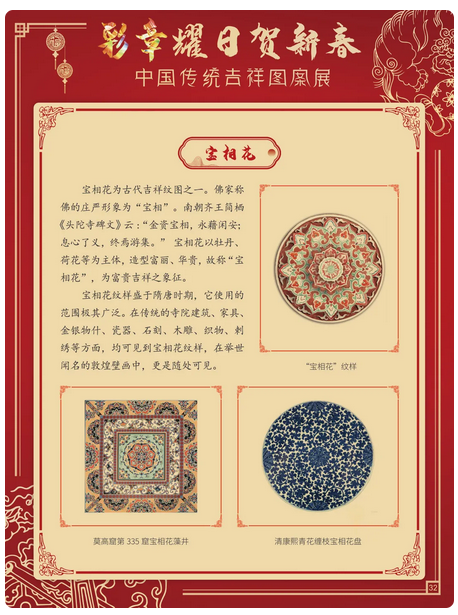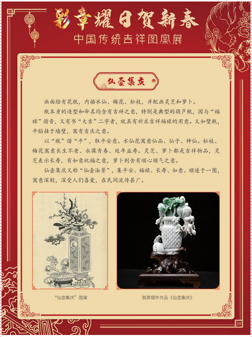 吉祥图案通常用人物、花卉、飞禽、走兽、器物和花体字等形象,以吉祥语、民间谚语和神话故事为题材,用借用、比拟、双关、象征以及谐音等表现手法,创造出图案与吉祥语的完美结合,被赋予祈求吉祥、消灾免难的寓意,从视觉和听觉的双重维度上,表达了人们对幸福生活的向往与追求。吉祥图案应用广泛,在生活的方方面面都可以见到其身影,尤其在染织、刺绣、地毯、壁挂、陶瓷、雕刻、建筑、绘画、剪纸等工艺美术用品以及喜庆场合应用的较为广泛。 值此农历新年的喜庆节日到来之际,我们策划了本次中国传统吉祥图案展,特别按照鸿福、长寿、吉祥、喜庆等吉祥寓意分类,展示中国传统吉祥图案的符号构成及其背后的故事,为新的一年献上祝愿,祝福大家新年吉祥! 江华瑶族自治县图书馆