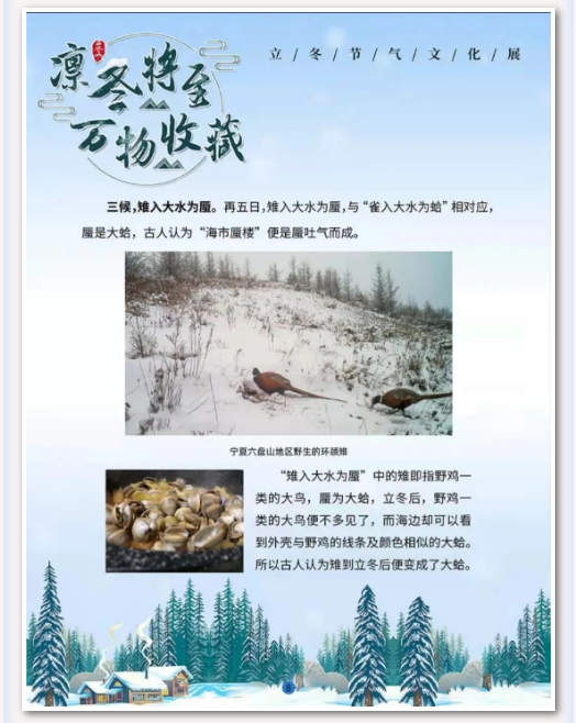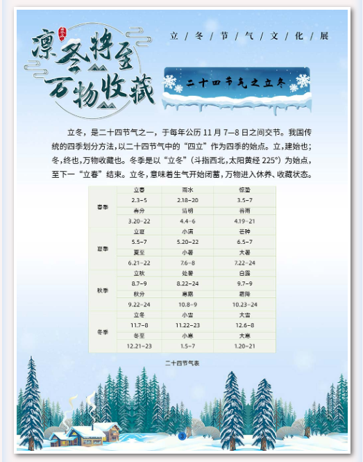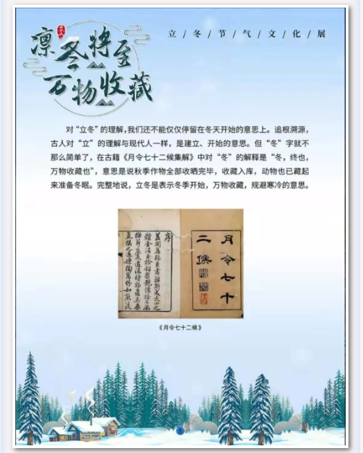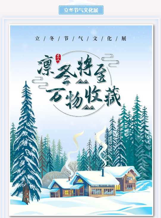 立冬是农历二十四节气之一,是冬季的第一个节气,也是中国传统节日之一。立,建始也,表示冬季自此开始。冬是终了的意思,有农作物收割后要收藏起来的含意。立冬之后,秋季少雨干燥气候渐去,开始向阴雨寒冻的冬季气候过渡。阳退阴生,生气闭蓄,万物开始收藏,蛰虫休眠,归避寒冷,万物开始休养生息。 提到立冬,大家就能想到的是“吃饺子”,其实除了吃饺子之外,立冬还有很多其他习俗,但是这些大多不为人们所熟知。因此,在立冬来临之际,我们特别策划本展览,为您介绍立冬丰富多彩的民俗文化、饮食文化和谚语文化。