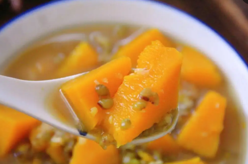 [功效] 绿豆甘凉,清暑、解毒、利尿;配以南瓜生津益气。这是夏季防暑最佳膳食。
