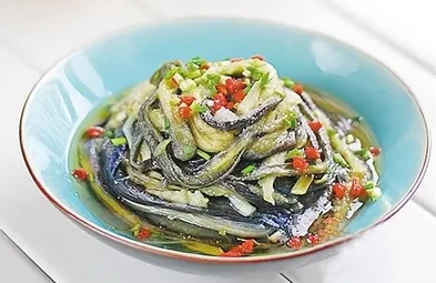 [做法] 茄子洗净削皮,切成小片,放入碗内,撒上少许盐,再投入凉水中,泡去茄褐色,捞出放蒸锅内蒸熟,取出晾凉。将炒锅置于火上烧热,加入麻油,下花椒炸出香味后连油一同倒入小碗内,加入酱油、白糖、米醋、精盐、蒜末,调成汁,浇在茄片上。