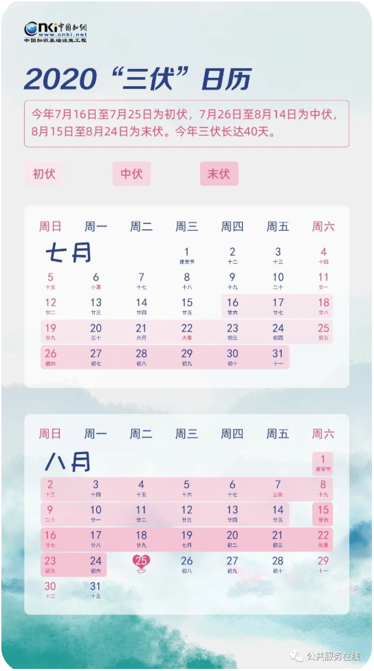 “三伏”是初伏、中伏和末伏的总称。三伏在小暑和大暑之间,是一年中最热的时候。天气炎热,注意防暑降温哦!